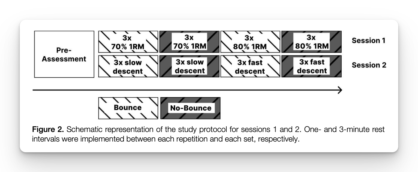 - Bounce squat ⮕ Actively accelerating into the bottom position to exploit the stretch-shortening cycle