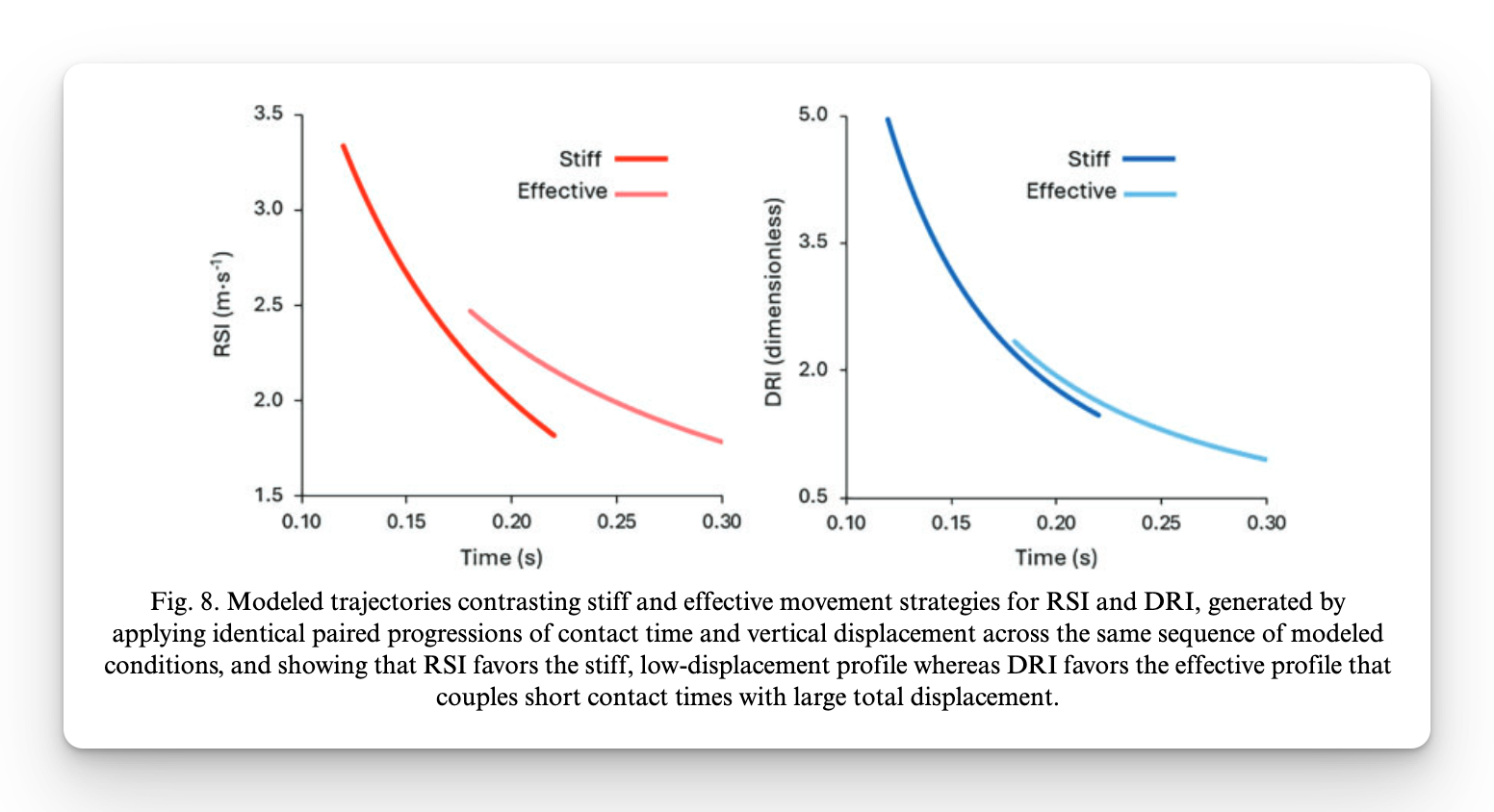 When modeled movement strategies were compared, RSI rose whenever contact time shortened, even if displacement remained modest. DRI only increased when short contact times were paired with large vertical displacements.