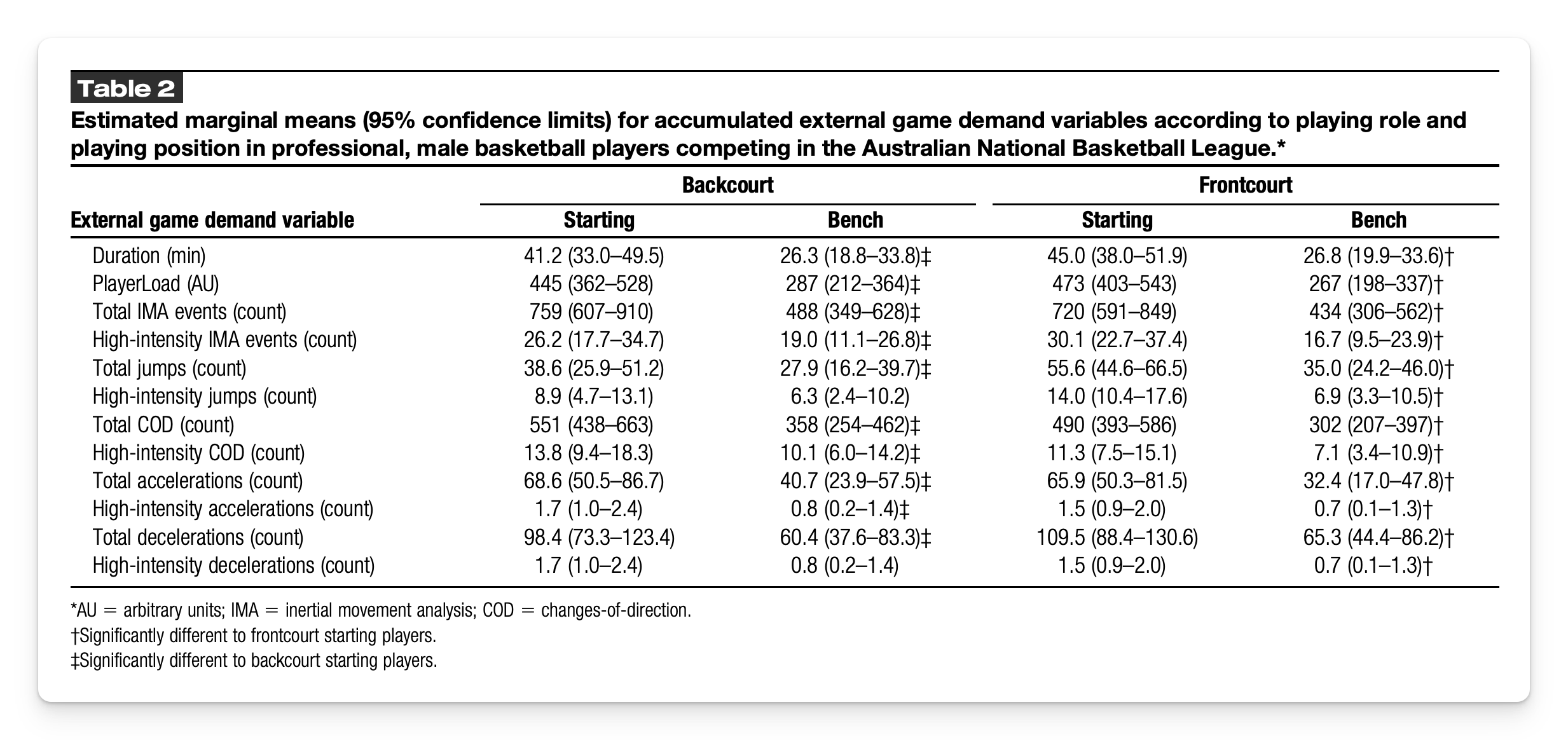 - However frontcourt players had more total and high-intensity jumps, while backcourt players (especially bench) had more high-intensity COD.
