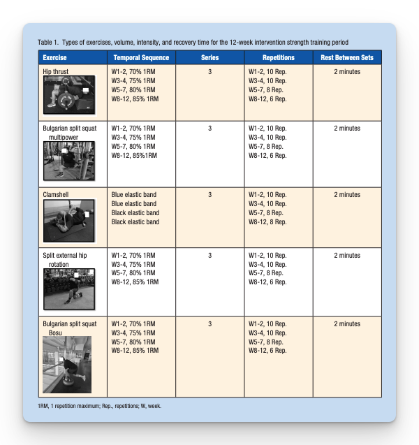 - Think hip thrusts and split squats at 70% to 85% 1RM, 3 sets of 10 down to 6, with 2 minutes rest, run in a tight circuit.