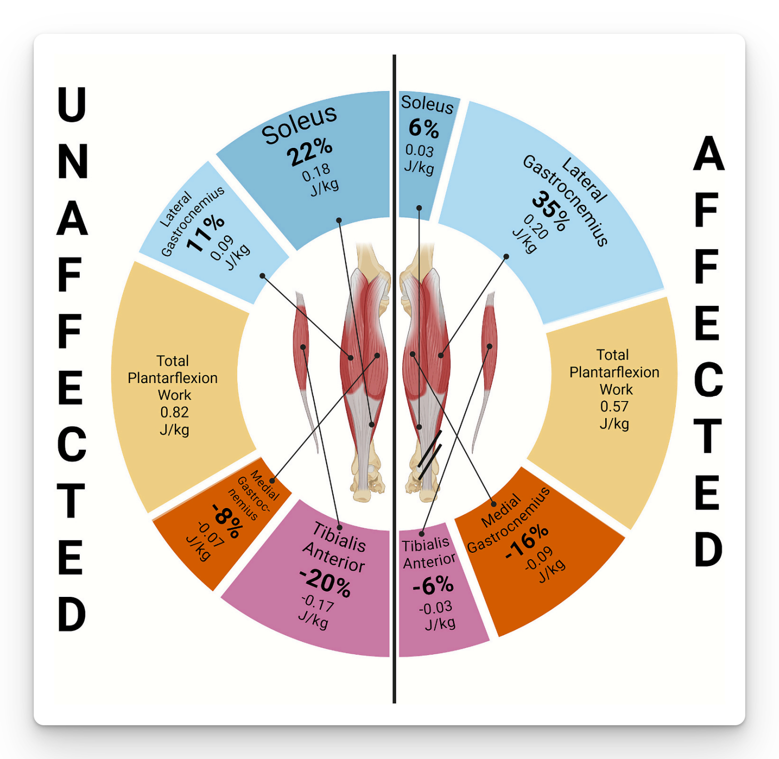 - For the lateral gastroc, the affected side had ~108% increase in work