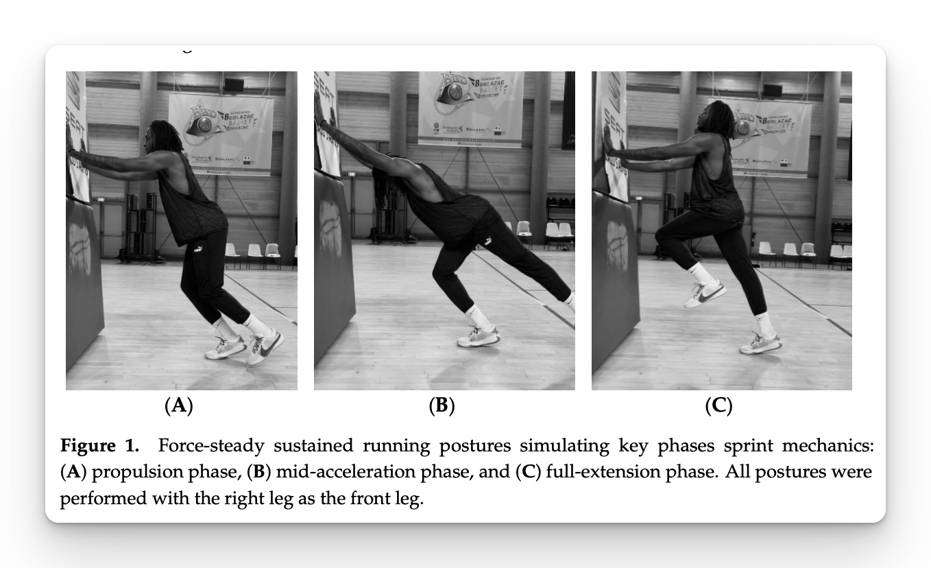 - Three sprint-like isometric positions: (A) Propulsion phase, (B) Mid-acceleration, and (C) Full extension.