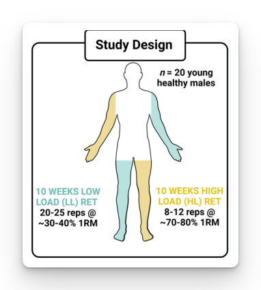 - The contralateral arm and leg trained with low load (LL): 20–25 reps with ~30–40% 1RM