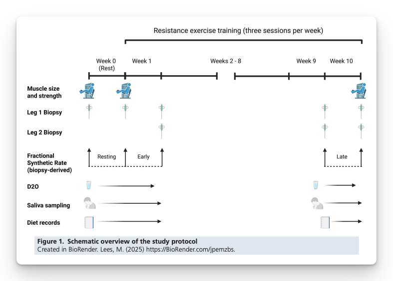 - Deuterated water to measure integrated myofibrillar protein synthesis (MyoPS) at week 1 (early training) and week 10 (trained state)