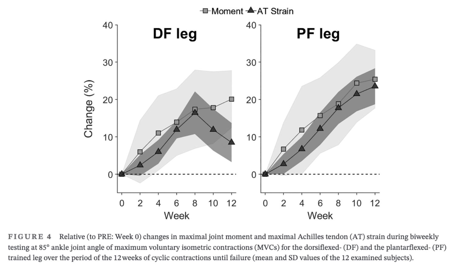 Researchers had 12 healthy, active adults (9 male, 3 female) perform 12 weeks of unilateral isometric plantarflexion contractions to failure (3 sets, 3x/week).