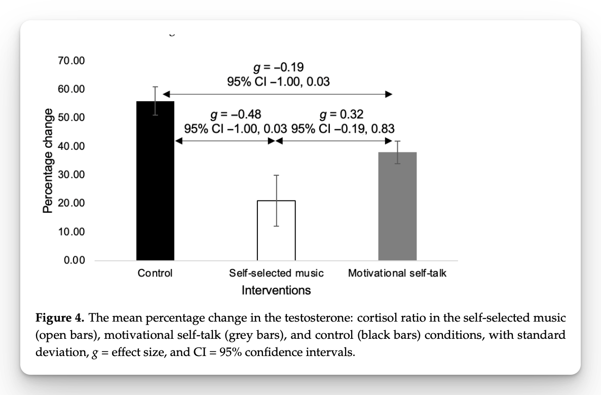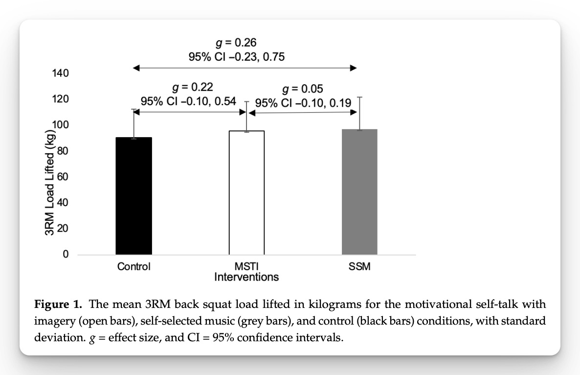 - Study 1: Self-selected music (SSM) or motivational self-talk + imagery (MSTI) → 3RM back squat.