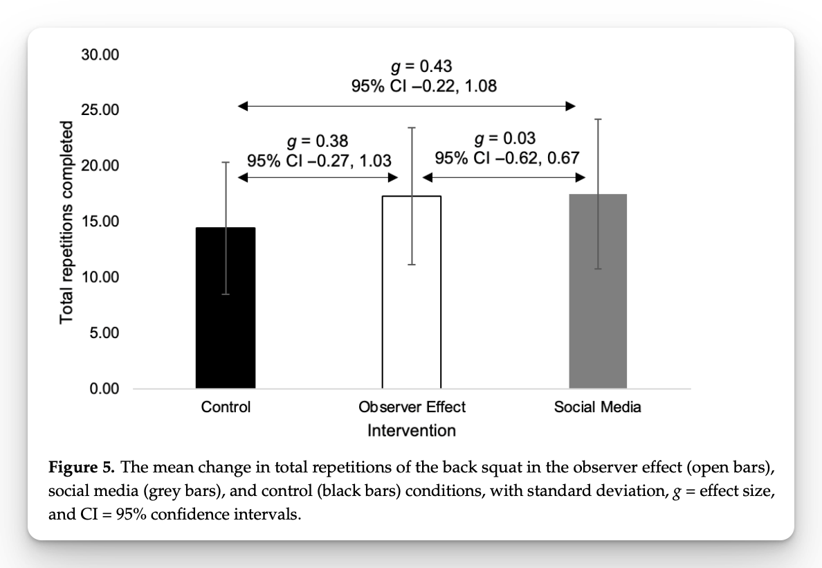 - Study 3: Observation via social media camera (SM) or in-person observers (OE) → 65%1RM back squat to failure; tracked reps and velocity.