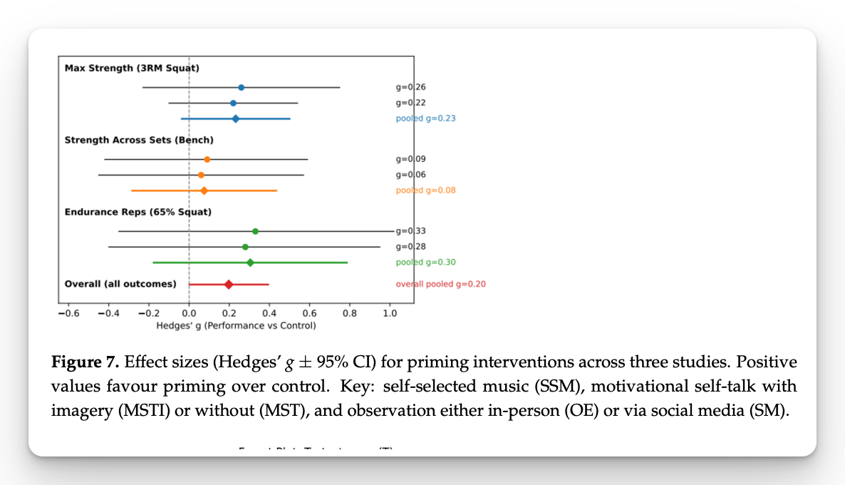 - Study 2: SSM or motivational self-talk (MST) → 4×4 bench press at 4RM; tracked volume load and bar velocity.