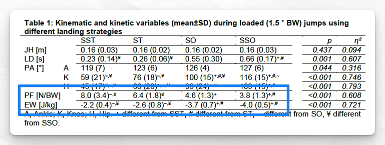 The figure below from Fritz et al. (2019) demonstrates that peak force was nearly half in the softest landing strategy, while lower limb eccentric work (sum of the ankle, knees, and hips) was nearly doubled.