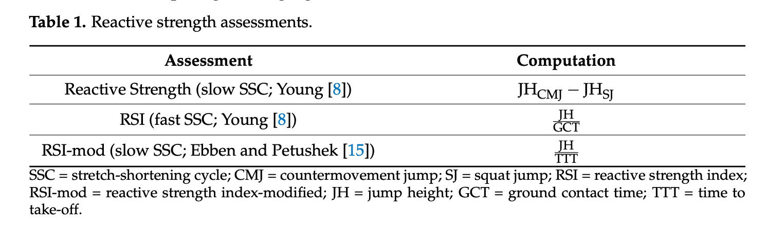 - RSI-mod = Jump height / Time to take-off from the CMJ.