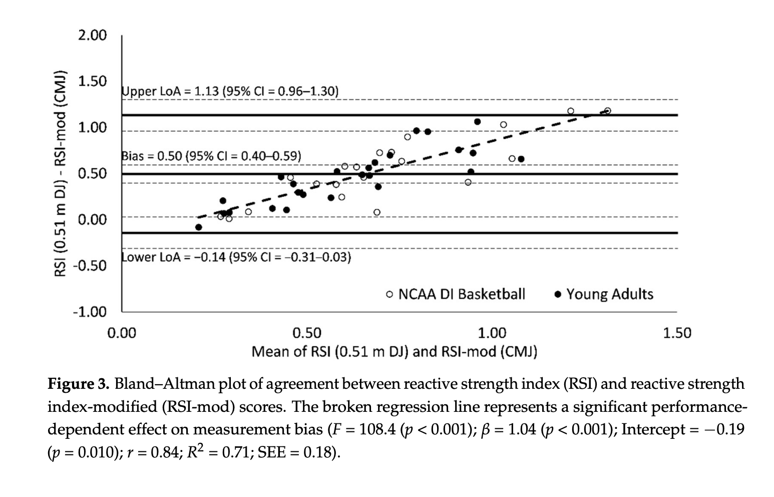 - CMJ-derived RSI-mod reflects explosive output in a slower SSC context without a discrete impact, so it behaves more like a controlled power metric than “true” reactive strength under impact.