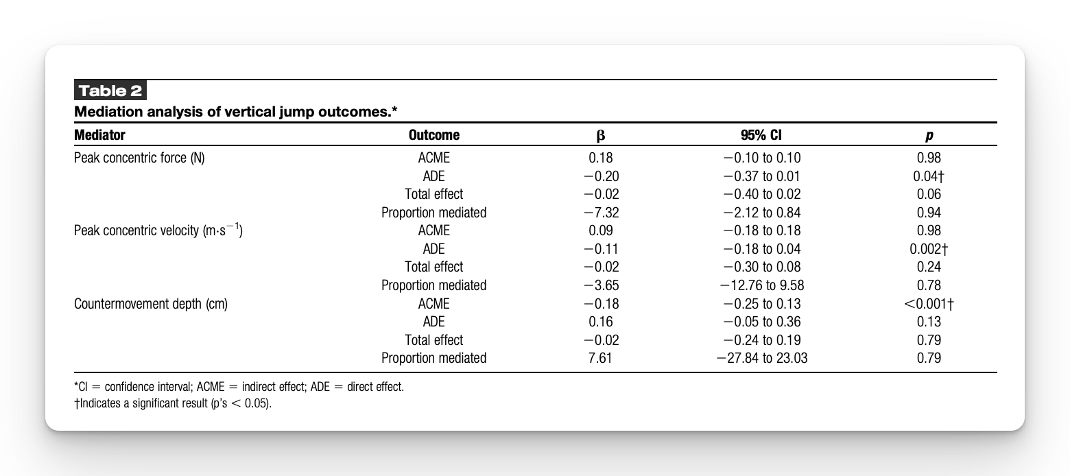 The only variable that significantly mediated the sleep–jump relationship was Countermovement Depth: