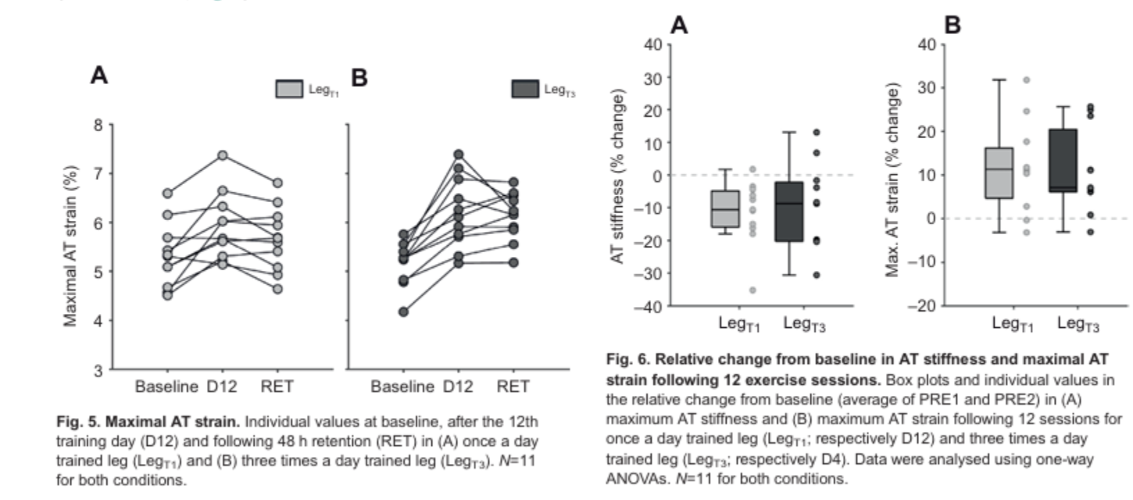 - LegT3 (3×/day): Tendon stiffness dropped ~24% and tendon strain rose ~20% after 8 days. This stuck even after 48 h rest.