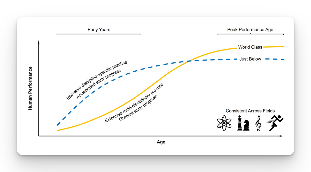 The highest-level adults tended to show more gradual early development, less early sport-specific practice, and more exposure to multiple sports or disciplines. That does not mean they trained less. It means their development was spread out rather than compressed.