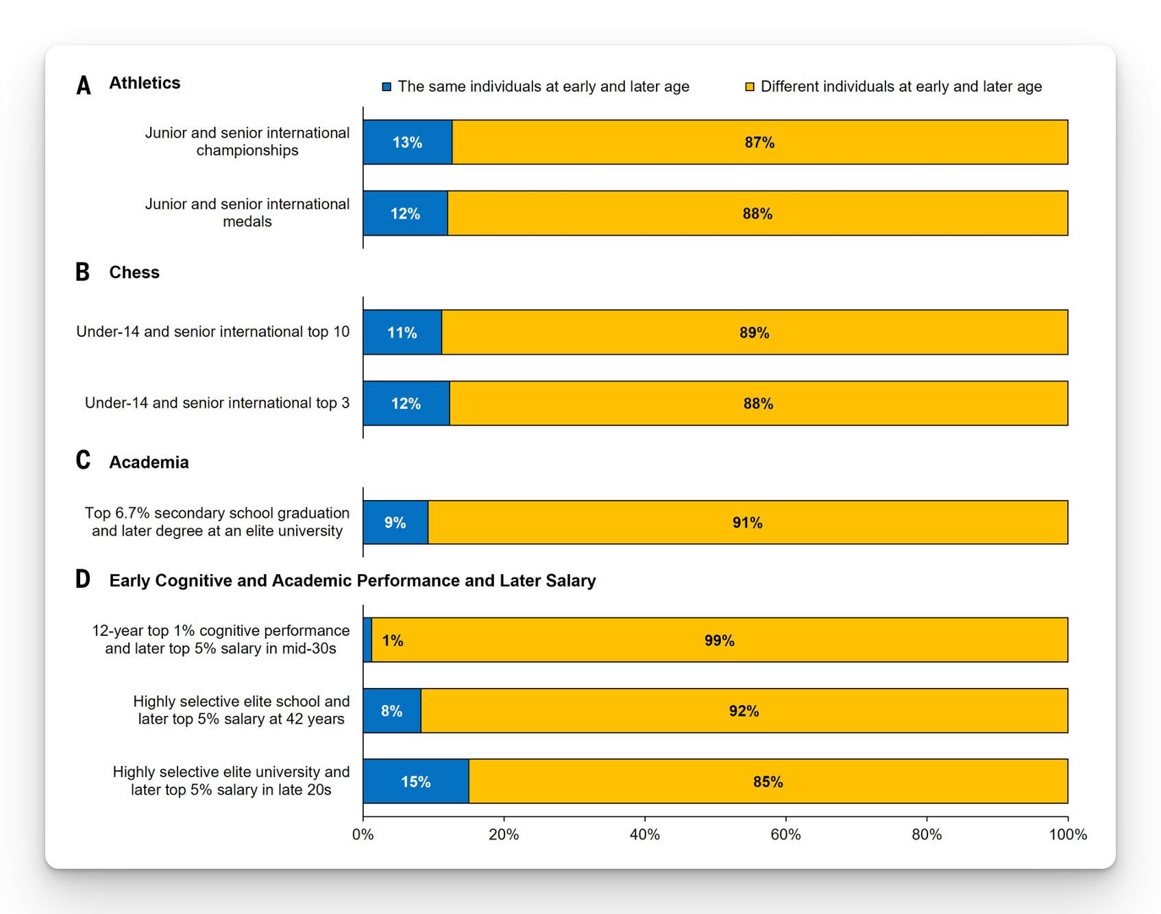 - In several datasets, around 85 to 90 percent of the athletes who reached the highest adult levels were not early stars.