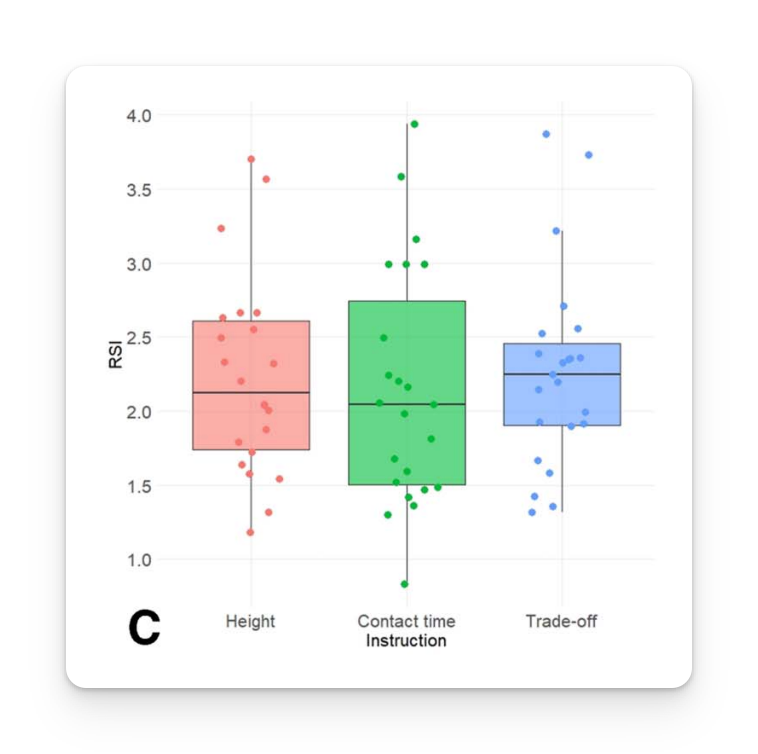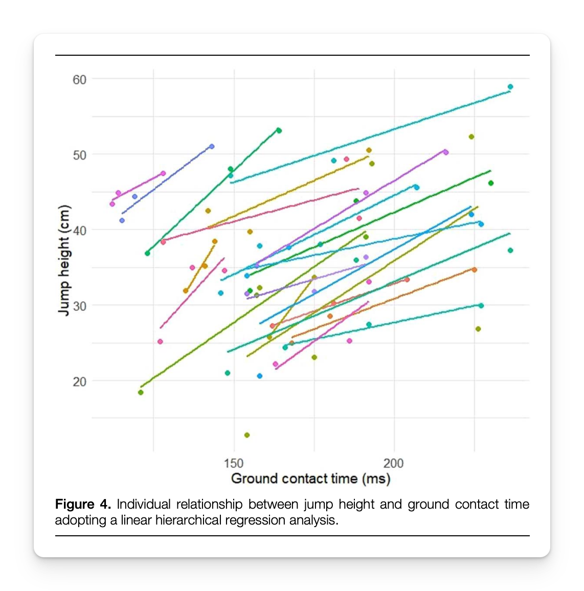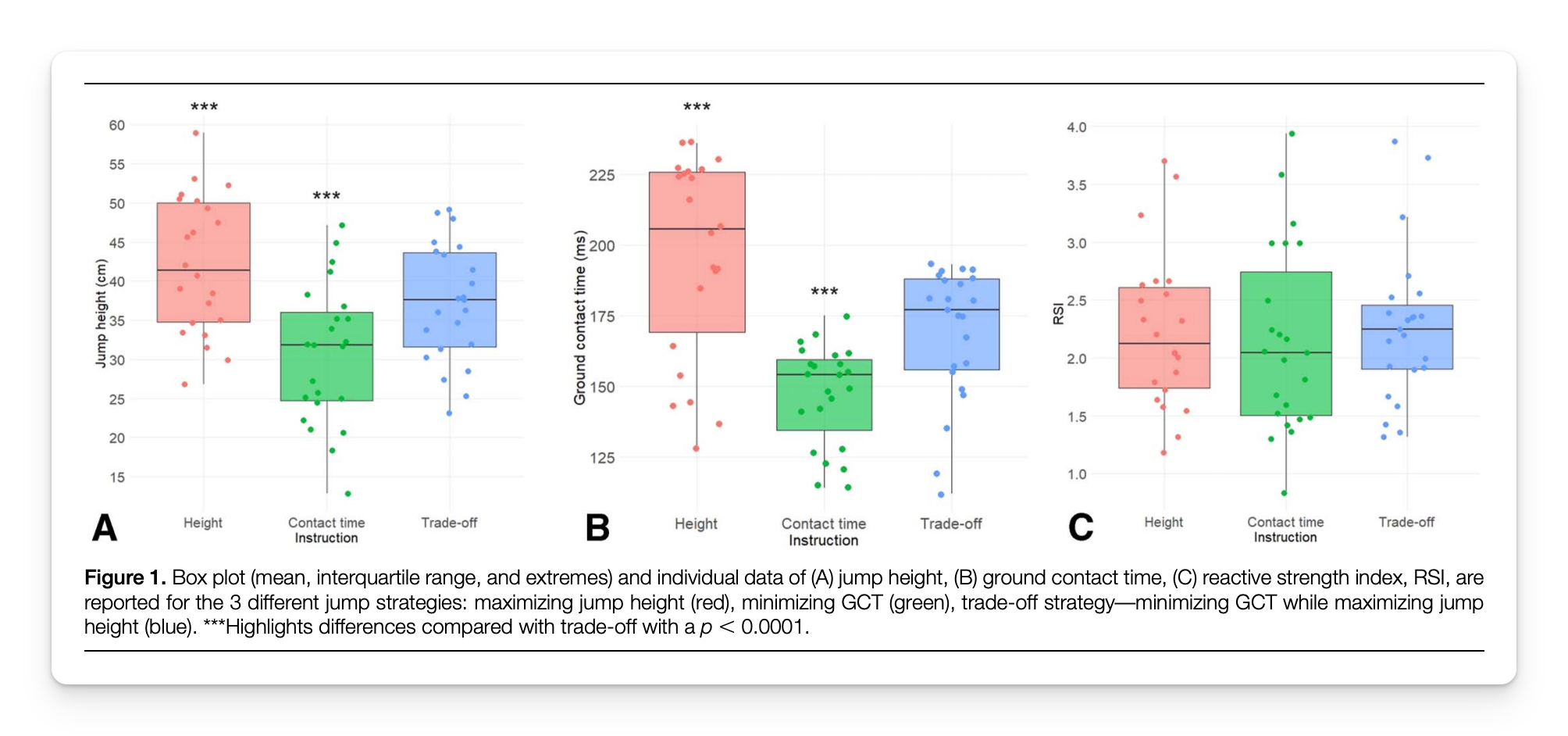 Measurements included ground contact time, jump height, and reactive strength index (RSI), while analysis examined how jump height scales with GCT