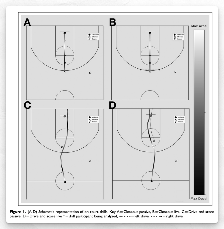 - Closeout (passive & live) ⮕ defender sprints from under basket to ball at the top, then brakes into stance.