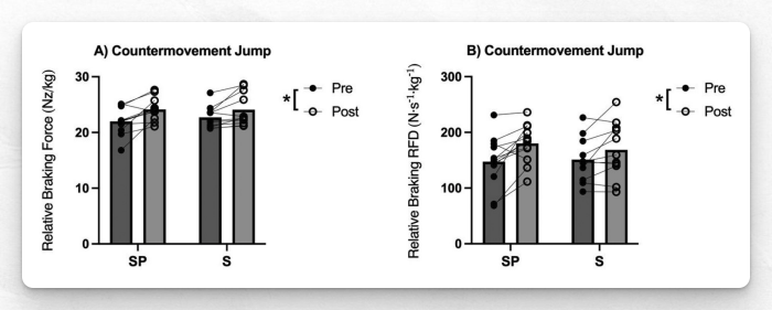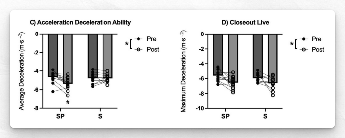 - Importantly, group×time for average deceleration and horizontal braking impulse favored SP (improved at post; S did not).
