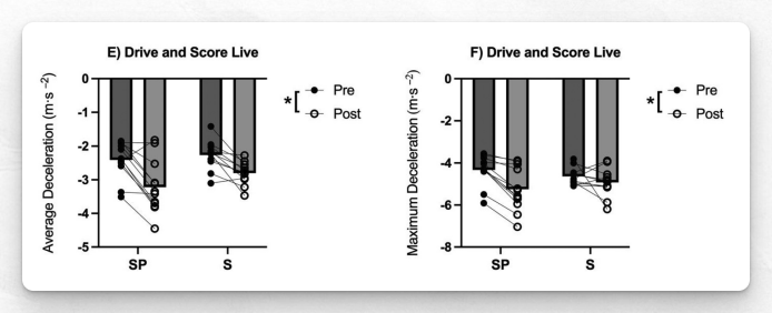 - Drive & Score (live): Time effects for max decel and average decel; SP showed robust gains (delta > MDC, CI > 0).