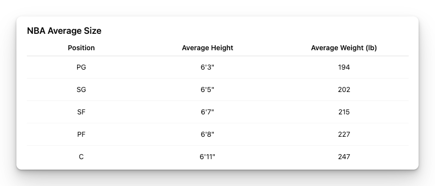 This tool gives you a quick height-based reference for what bodyweight tends to look like at the NBA level.