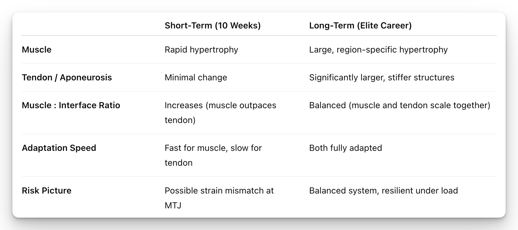 In short, ten weeks builds muscle, while ten years builds a balanced muscle–tendon system.