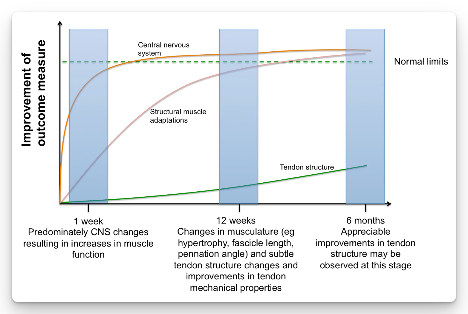 When you line these two studies up side by side, the picture becomes clear: muscle adapts fast, tendon adapts slow.